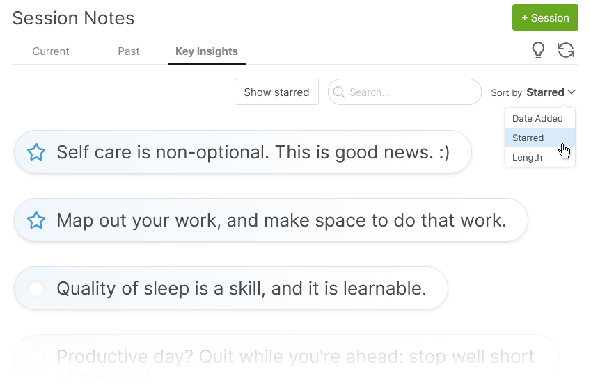 Key Insights make Session Notes even better, by allowing you to mindfully capture what really mattered from a given session (usually it’s 1-3 insightful statements) that are ripe for review and keeping focused on.  Let them know this area will always be the place to get the top line insights that have accumulated while working with you, and that they can click on any one of them to jump to the full session notes from which the insight came.